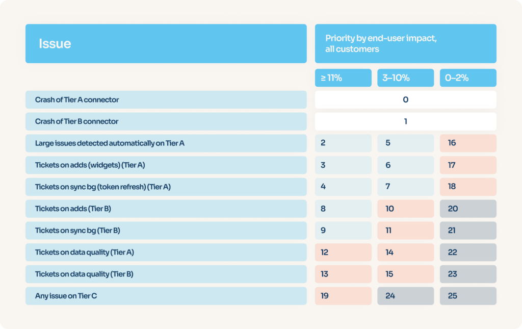 After we had a balanced system where all of our connectors were attributed a Tier, we could define realistic quality targets for each Tier. We agreed on the single most important quality metric (the new account connection success rate) and we chose to commit to a target number for Tier A and Tier B connectors—but not on Tier C: those would remain best effort. Meaning, we fix when Tier A and Tier B issues are under control.