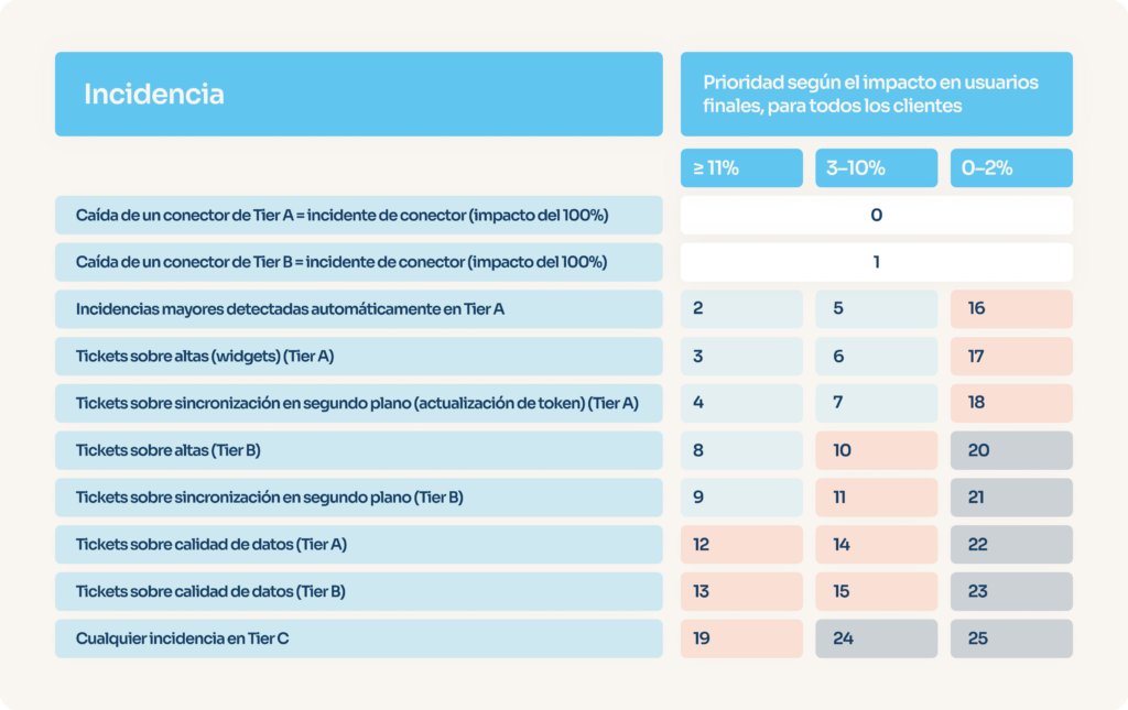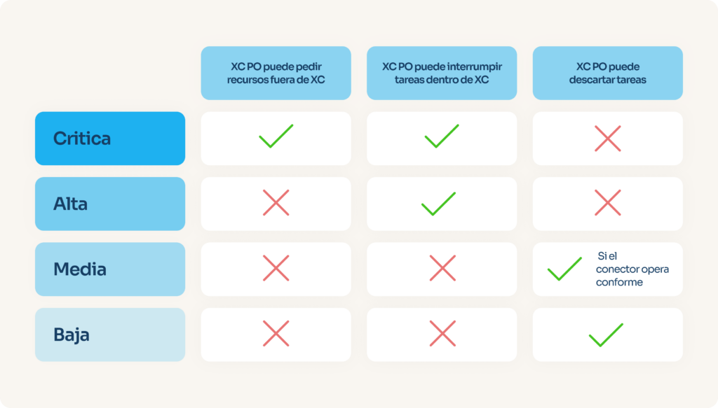 Por eso, decidimos clasificar todas las prioridades en cuatro categorías: crítica, alta, media y baja. Según la categoría, el Product Owner del equipo de conectores tiene más o menos margen de decisión.